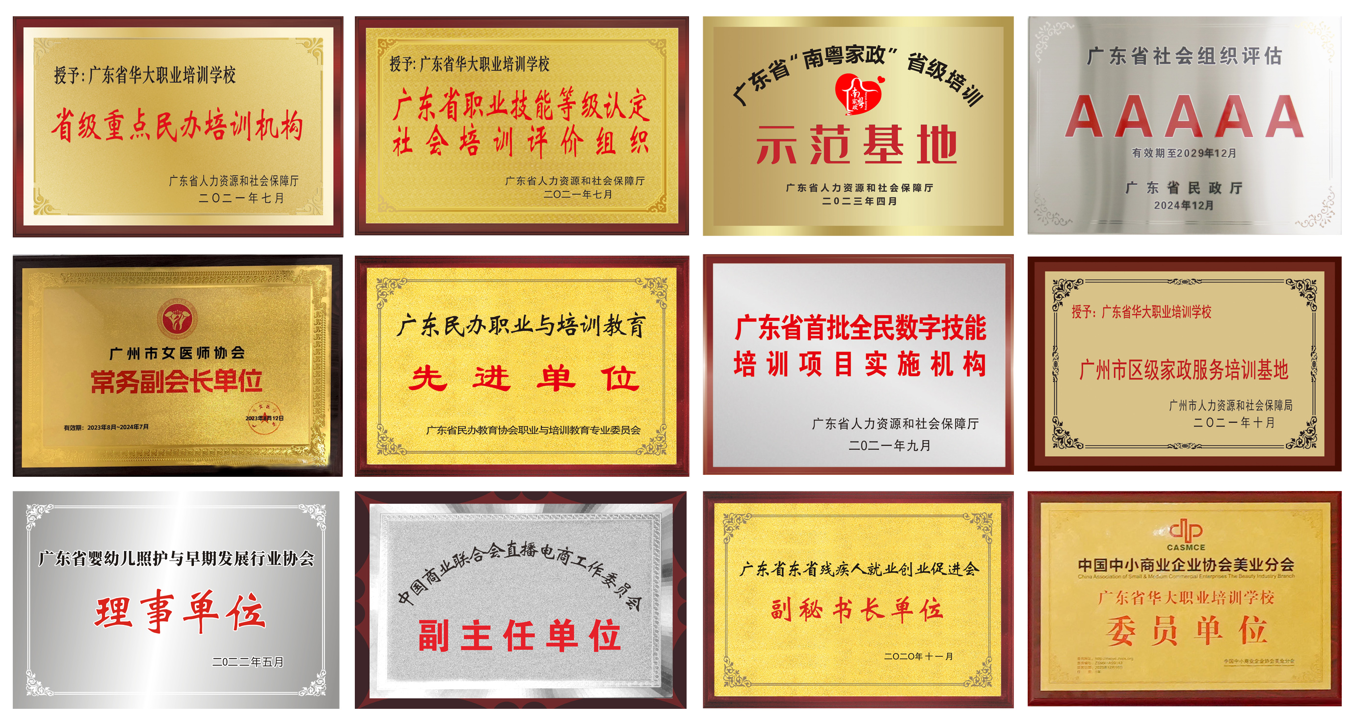 学校2021年被省人社厅评为“省级重点民办职业培训机构”,成为首批广东省职业技能等级认定社会培训评价组织(人社部备案号S000044007011),具有美容师、皮肤管理师、美甲师、健康照护师职业技能等级评价资质,可在全省各市开展等级认定工作,其评价结果纳入当地人才统计,享受属地人才激励政策。同时,学校还是广东省5A级社会组织、广东省“南粤家政”省级培训示范基地、广州市女医师协会常务副会长单位、广东省首批全民数字技能培训项目实施机构、中国商业联合会直播电商工作委员会副主任单位等荣誉。