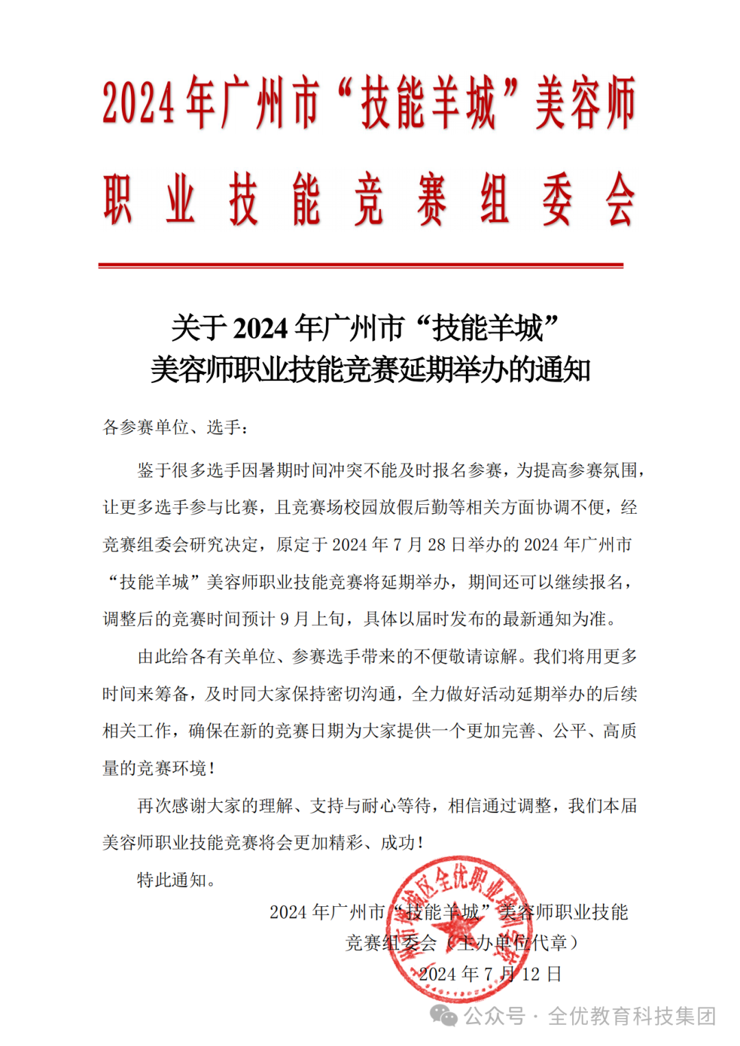 【通知】关于2024年7月广州市美容师职业技能竞赛延期,选手可继续报名!