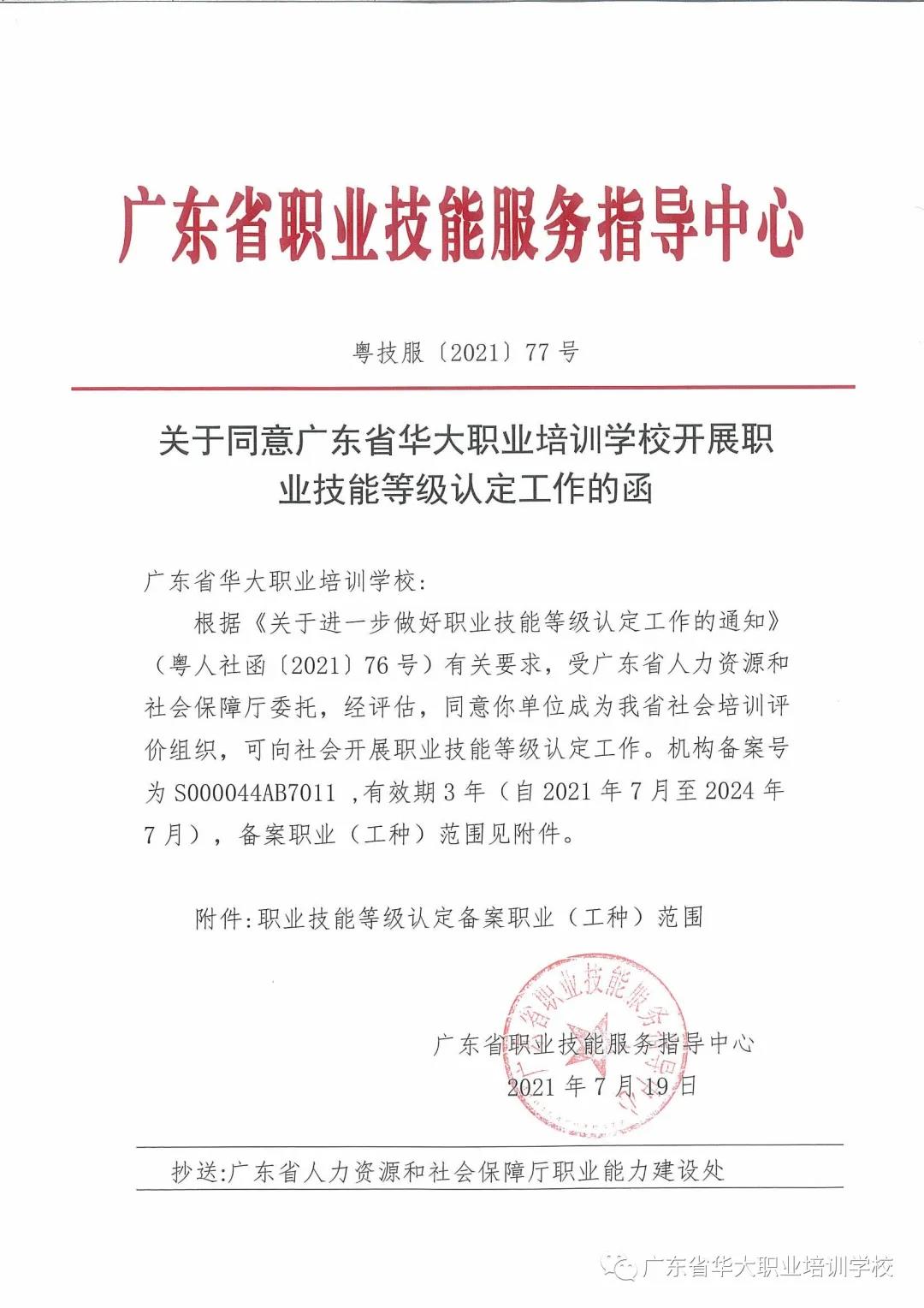 按照《关于进一步做好职业技能等级认定工作的通知》(粤人社函[2021]76号)等文件精神,按照自愿申报、择优遴选原则,通过全省公开征集、各地市人社部门推荐,省级统一遴选备案的流程,经专家评审和公示无异议后,广东省华大职业培训学校获得“省级重点民办培训机构”荣誉称号,并同时获批成为广东省2021年第一批职业技能等级认定社会培训评价组织机构。