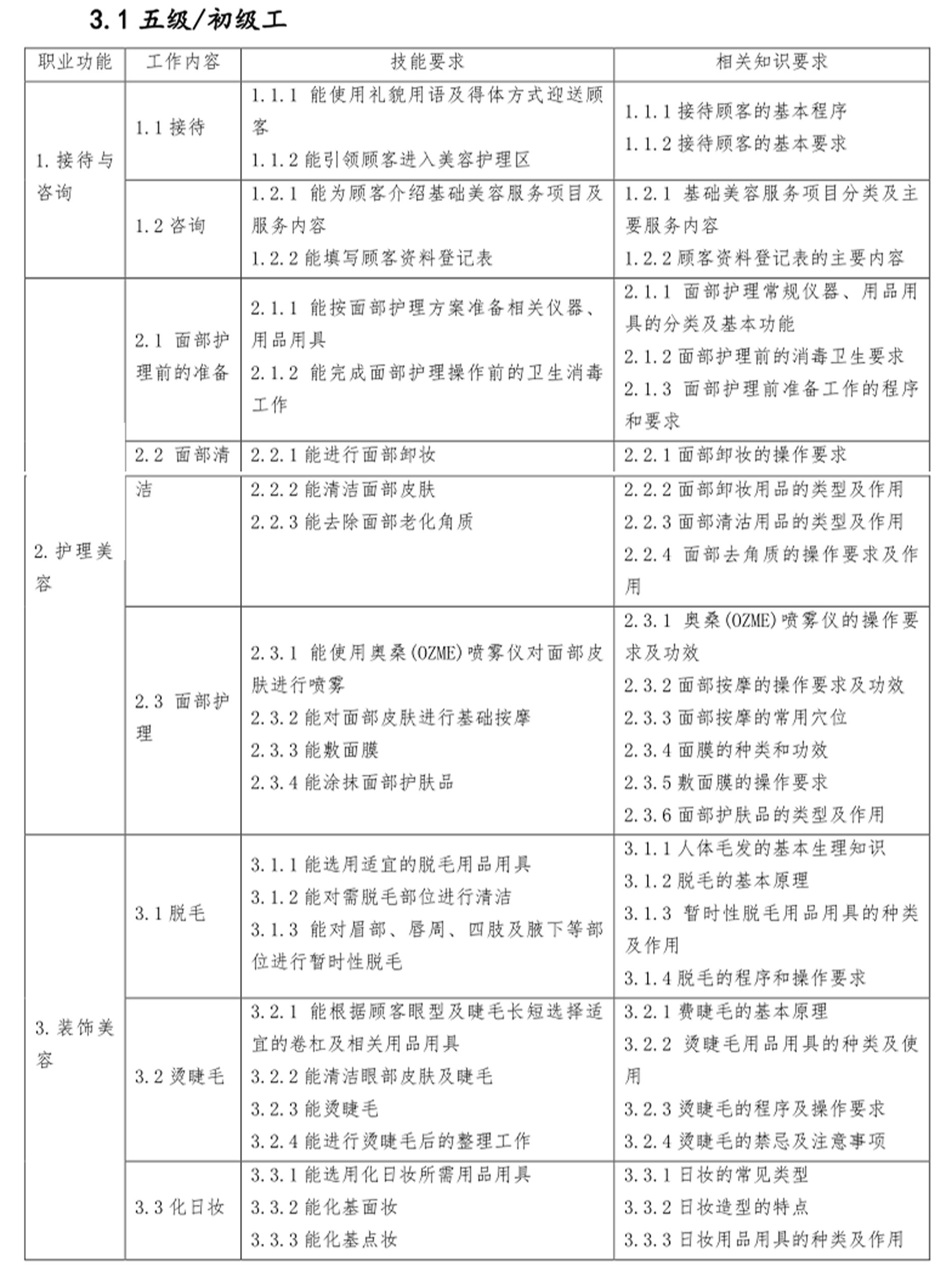 美容师职业技能等级考试共有五个级别,分别为五级/初级工、四级/中级工、三级/高级工、二级/技师、一级/高级技师。