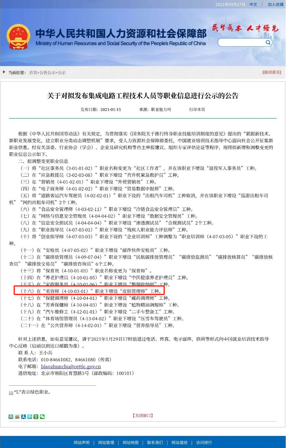 在这次大典修订中,“皮肤管理师”正式写入大典,成为“美容师(4-10-03-01)”职业下增设的新工种。