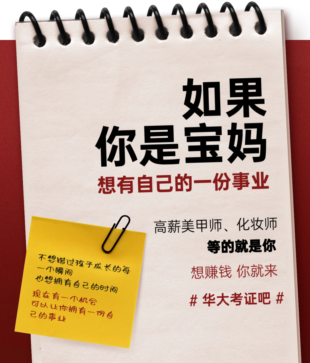 如果你是宝妈想有自己的一份事业 高薪自由职业美甲师、化妆师等的就是你!想赚钱就来华大考个美甲师证书或美容师证书开启你的新事业之旅吧!