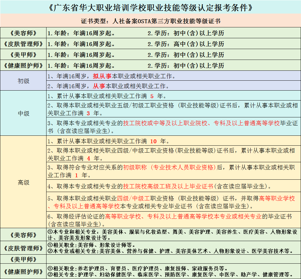 广东省华大职业培训学校2021年被省人社厅评为“省级重点民办职业培训机构”,是广东省首批第三方职业技能等级认定社会培训评价组织,已在全省多市十多个考点开展美容师(三、四、五级)职业技能等级认定工作。同时,学校被评为广东省“南粤家政”省级培训示范基地,广州市区级家政服务培训基地,广州市专项职业能力证书定点考场等。