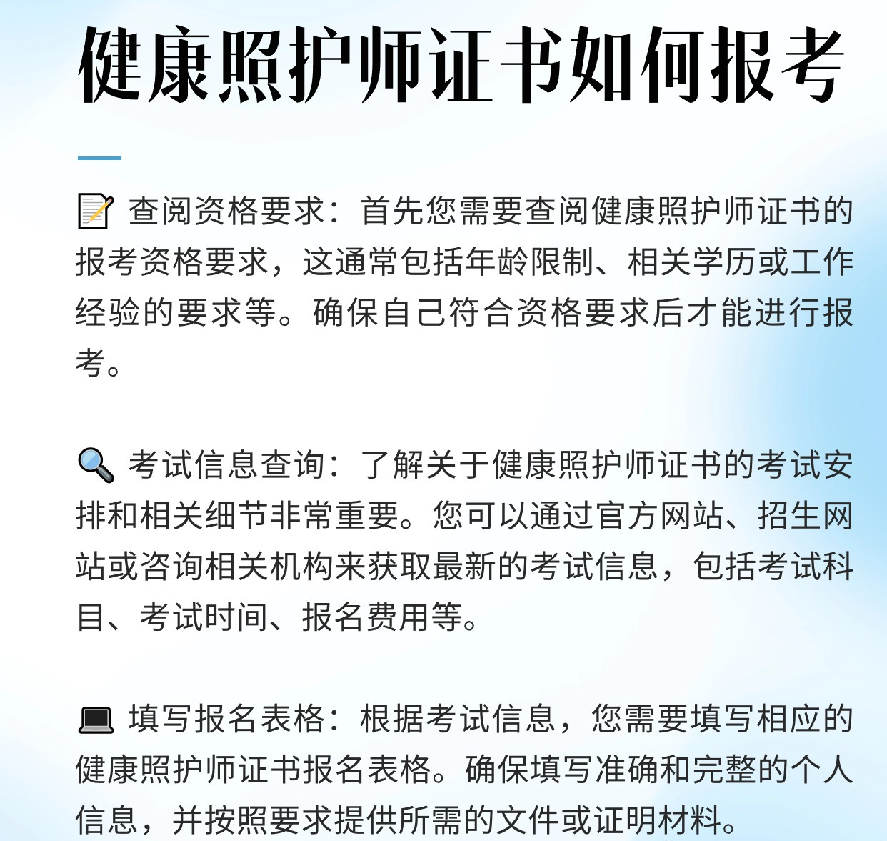 作为一名合格的健康照护师,您需要具备专业的理论知识、实践技能以及良好的服务态度。获得这一证书不仅是对您专业能力的肯定,也是对您职业生涯的一种投资。在求职过程中,持有健康照护师证书的您将更具竞争力,更容易获得面试机会。