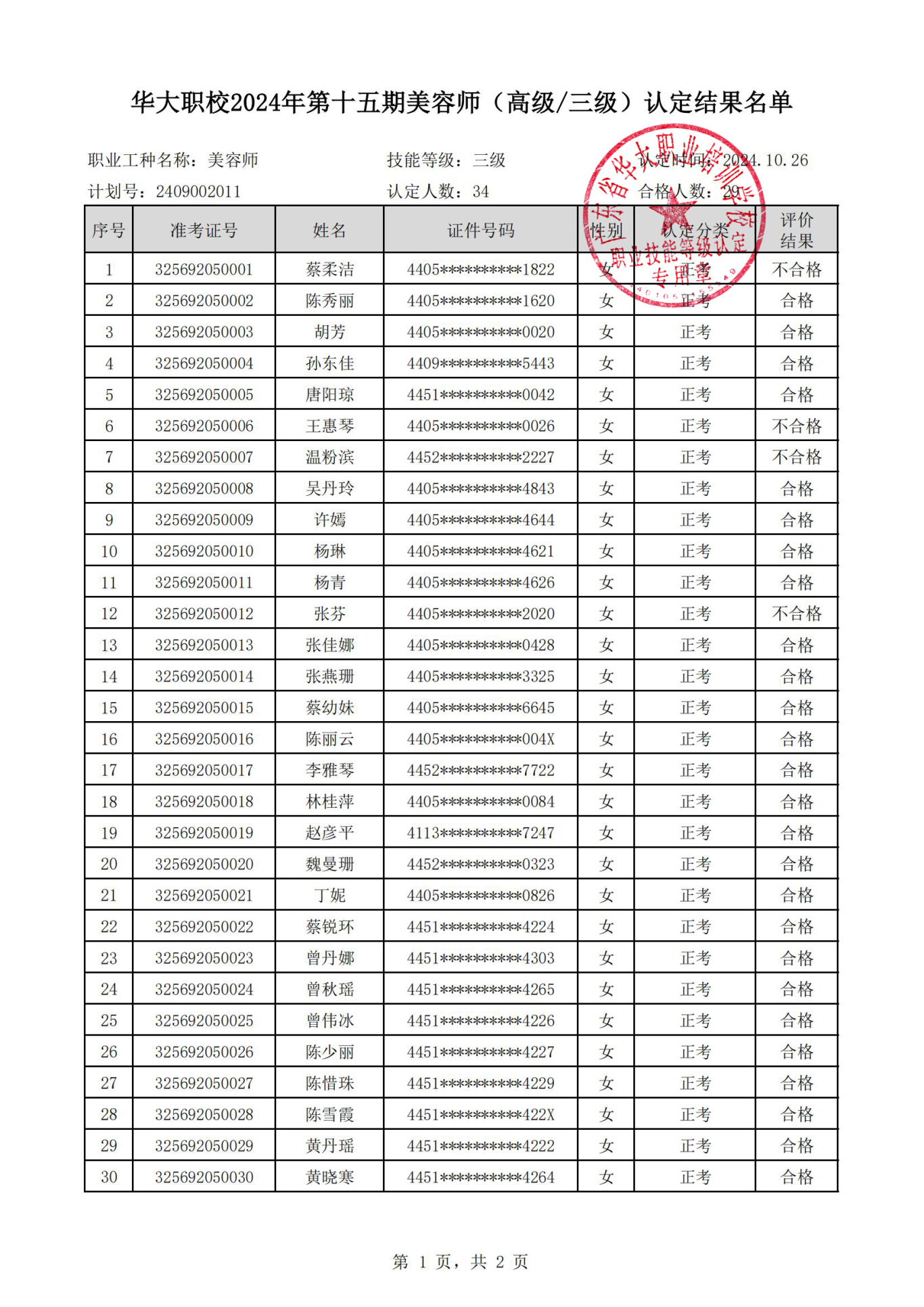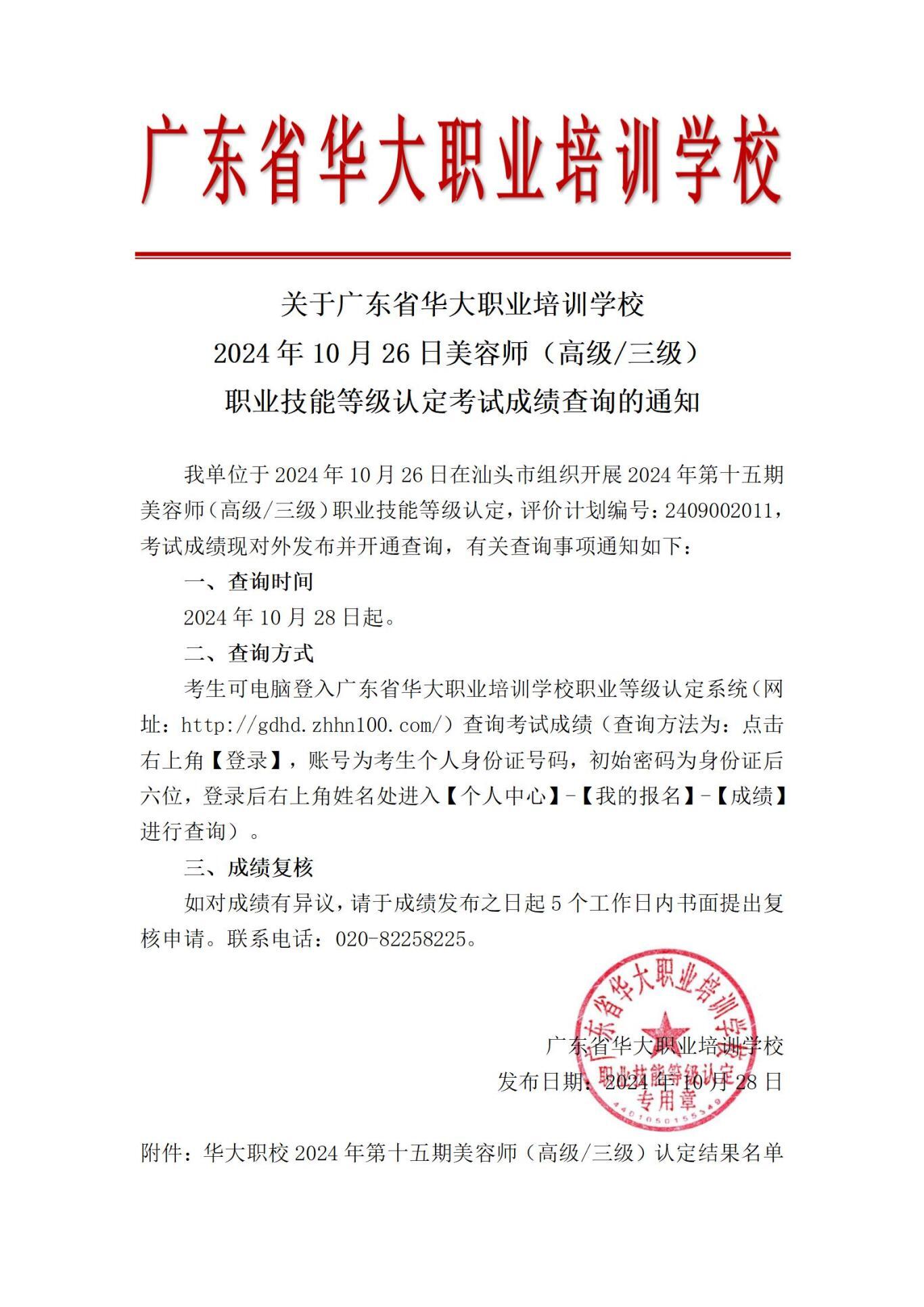 关于华大职校2024年第十五期美容师(高级/三级)等级认定考试成绩查询的通知(评价计划编号:2409002011)
