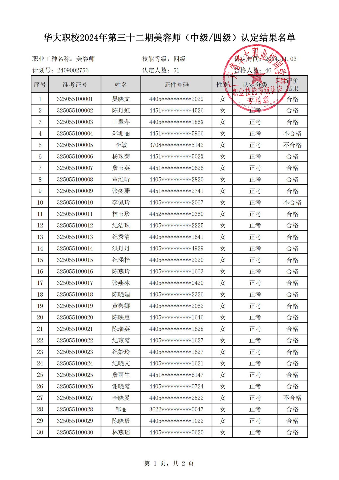 关于华大职校2024年第三十二期美容师(中级/四级)等级认定考试成绩查询的通知(评价计划编号:2409002756)