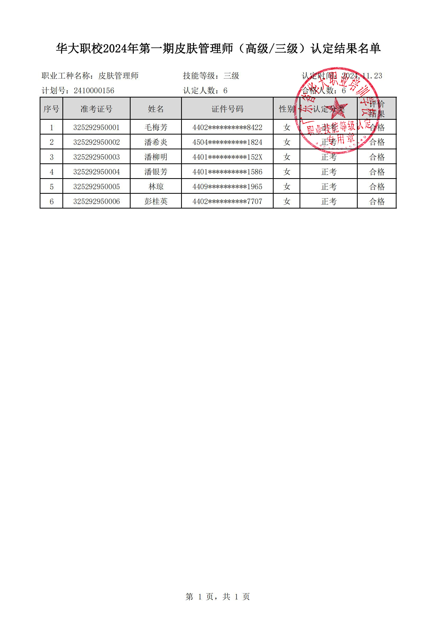关于华大职校2024年第一期皮肤管理师(高级/三级)等级认定考试成绩查询的通知(评价计划编号:2410000156)