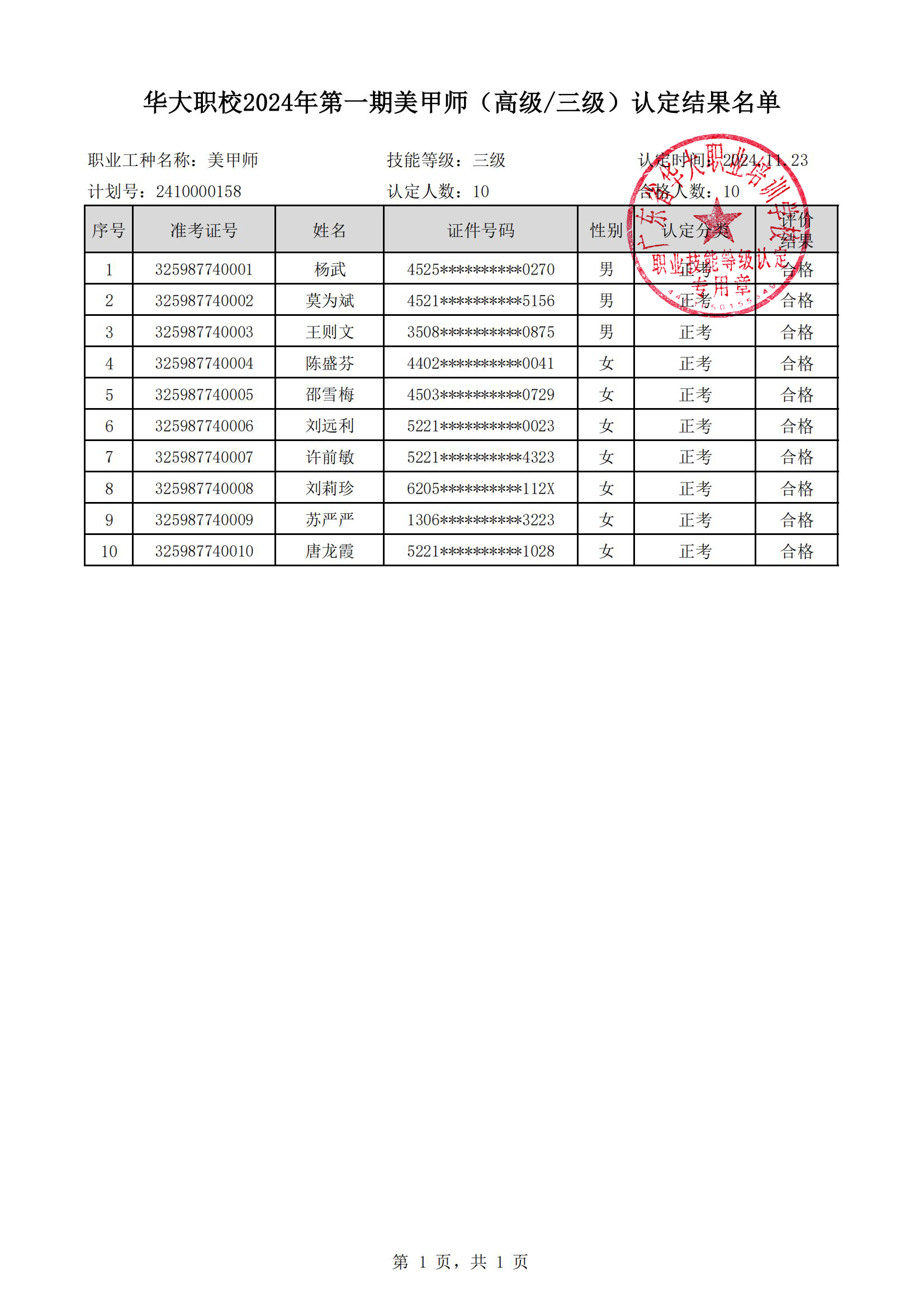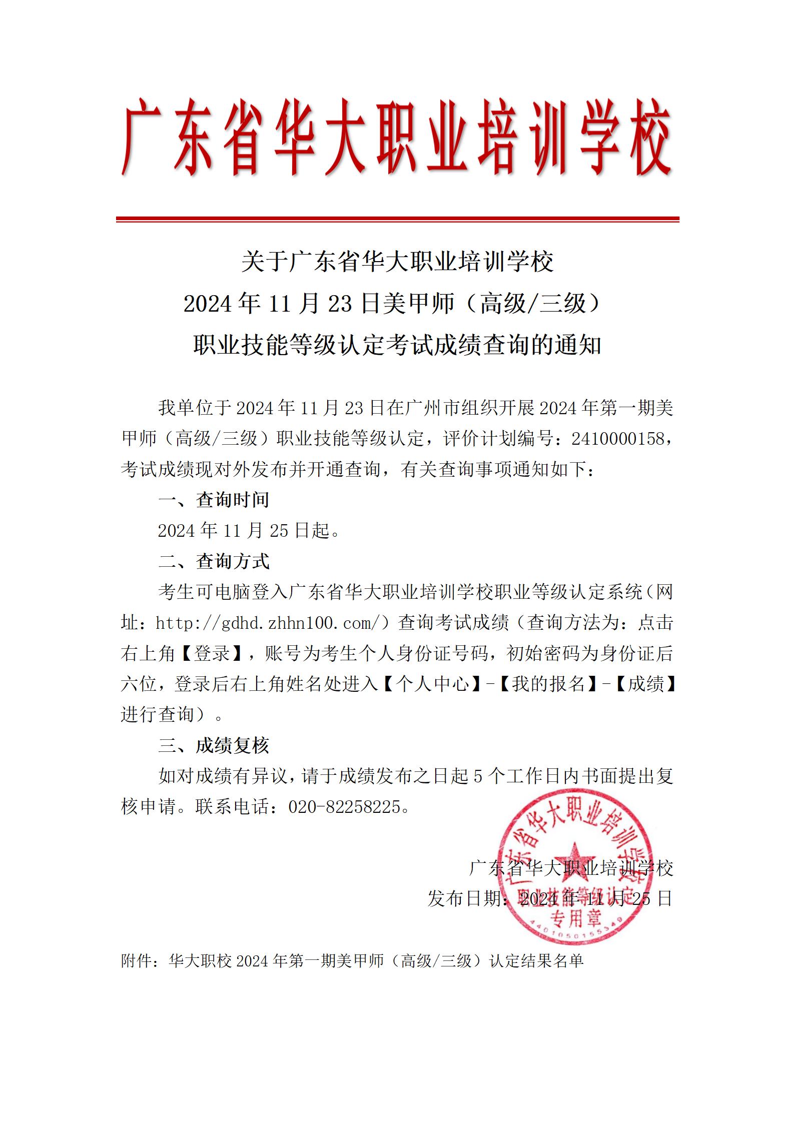 关于华大职校2024年第一期美甲师(高级/三级)等级认定考试成绩查询的通知(评价计划编号:2410000158)
