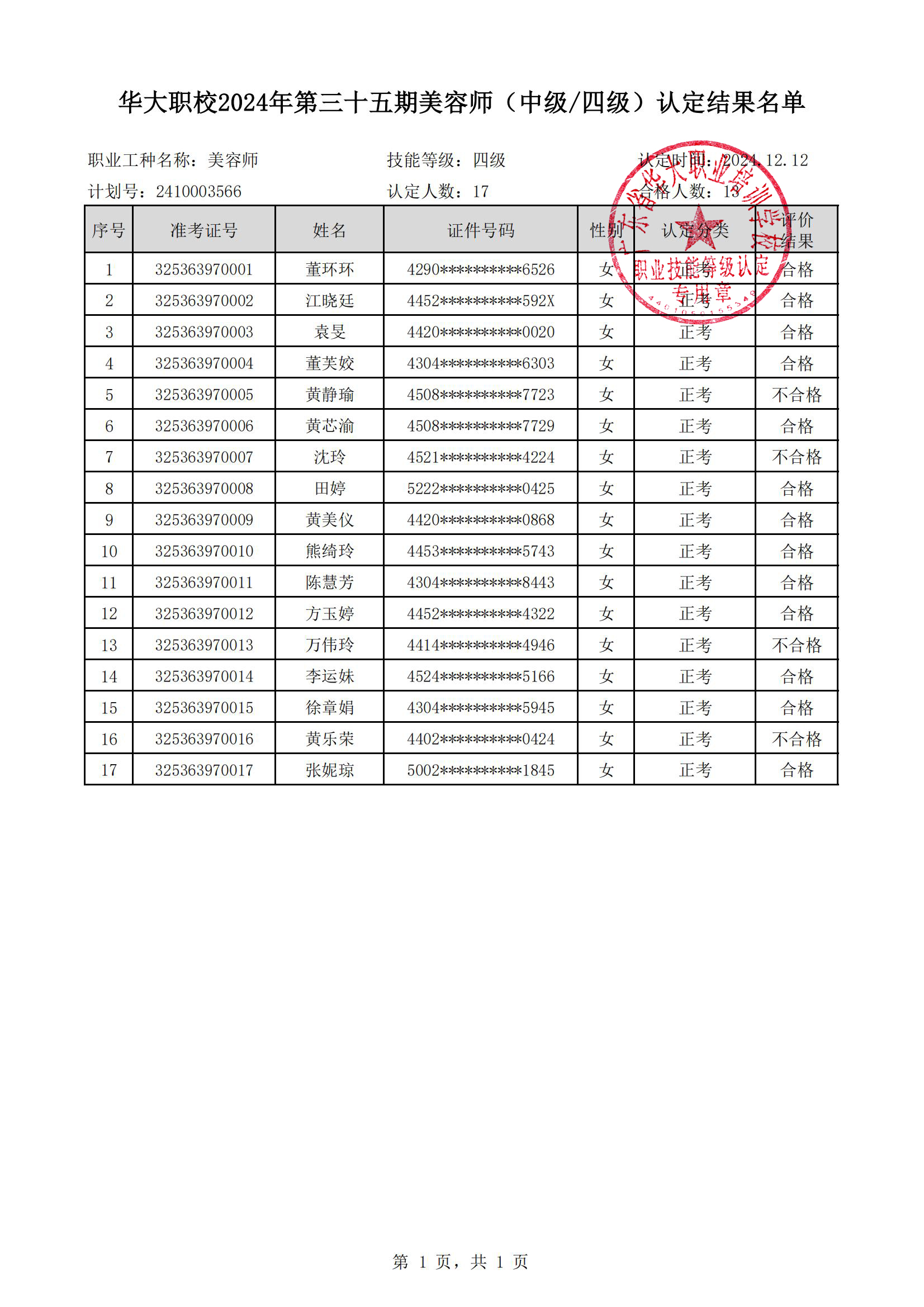 关于华大职校2024年第三十五期美容师(中级/四级)等级认定考试成绩查询的通知(评价计划编号:2410002566)