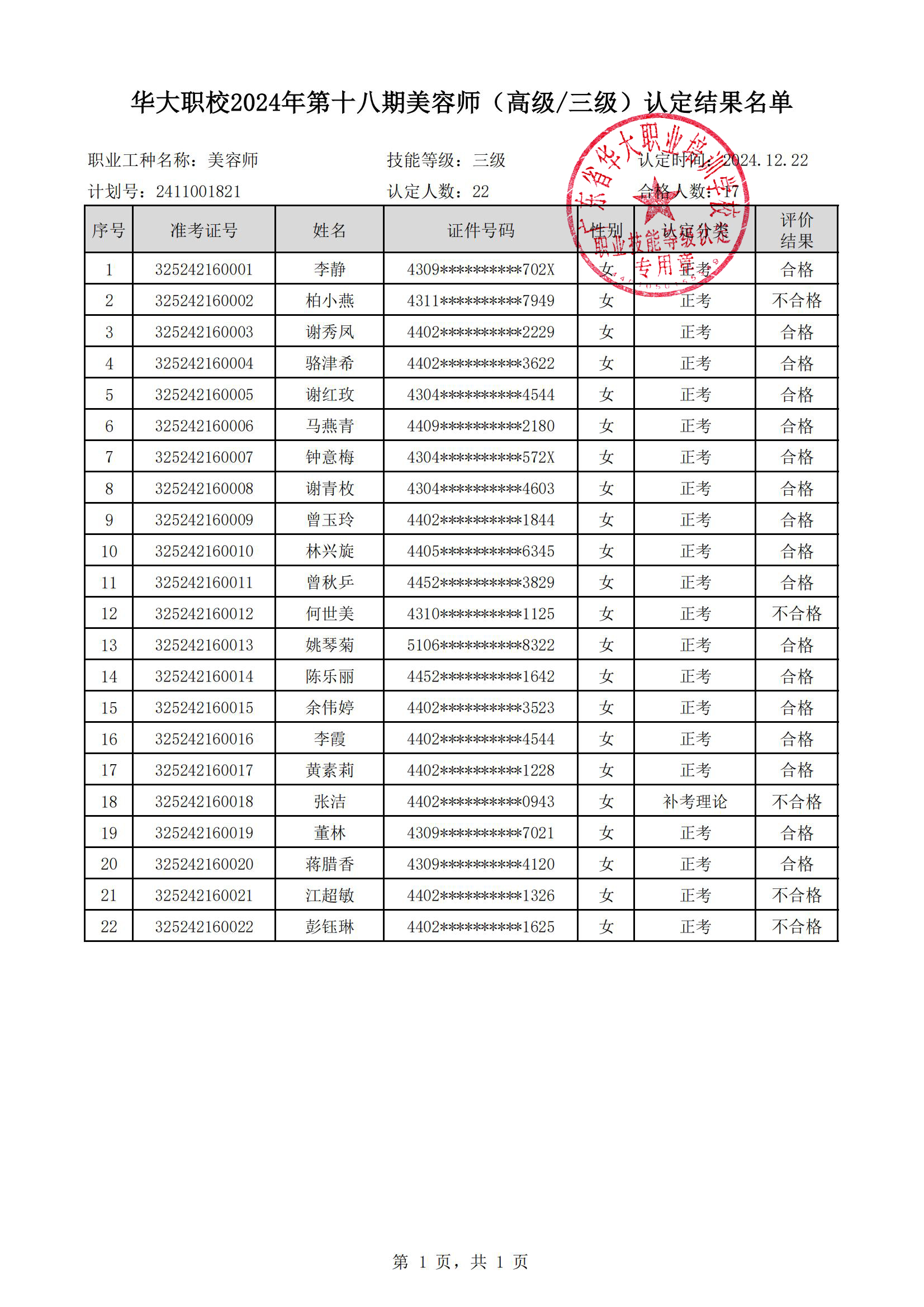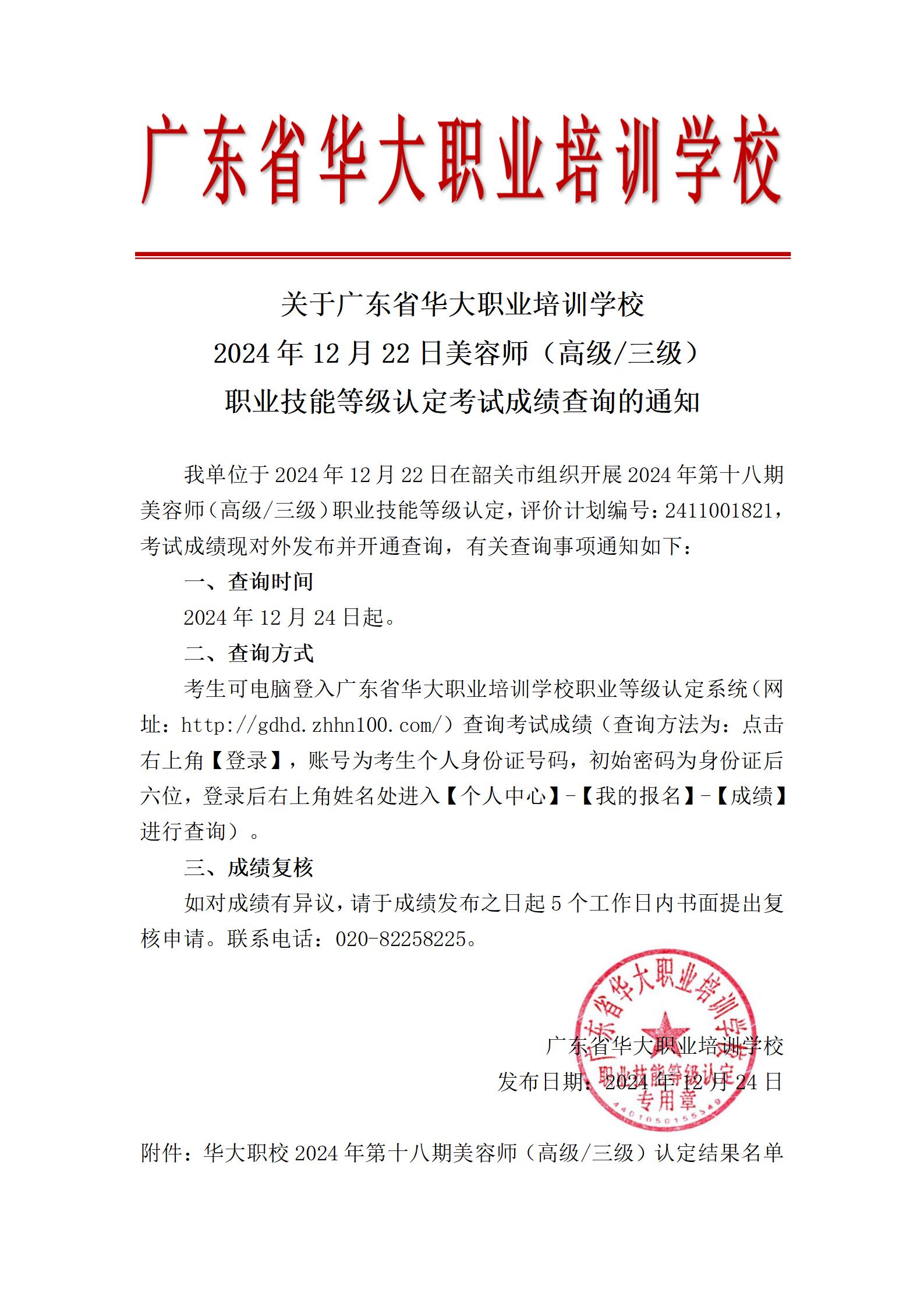 关于华大职校2024年第十八期美容师(高级/三级)等级认定考试成绩查询的通知(评价计划编号:2411001821)
