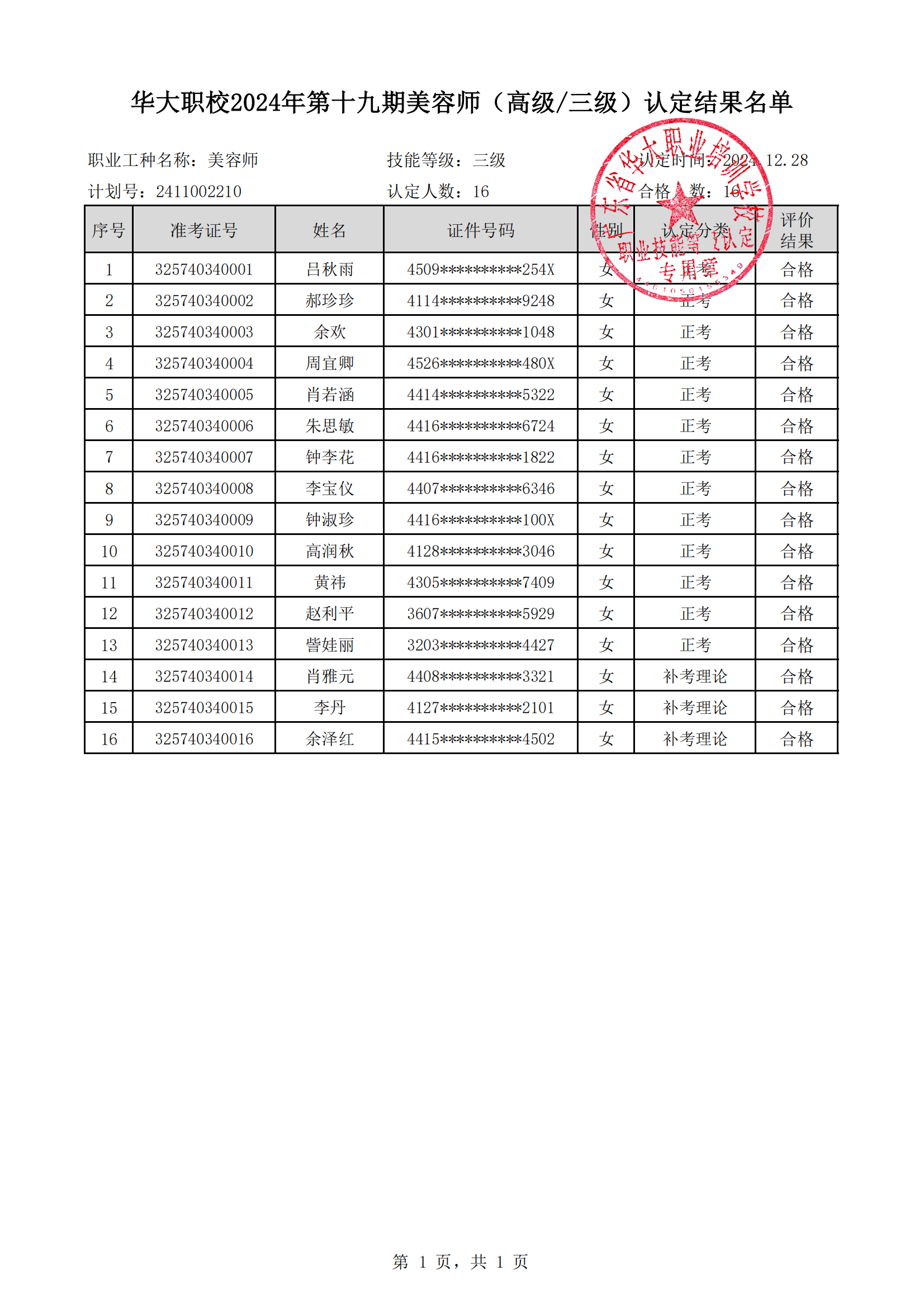关于华大职校2024年第十九期美容师(高级/三级)等级认定考试成绩查询的通知(评价计划编号:2411002210)