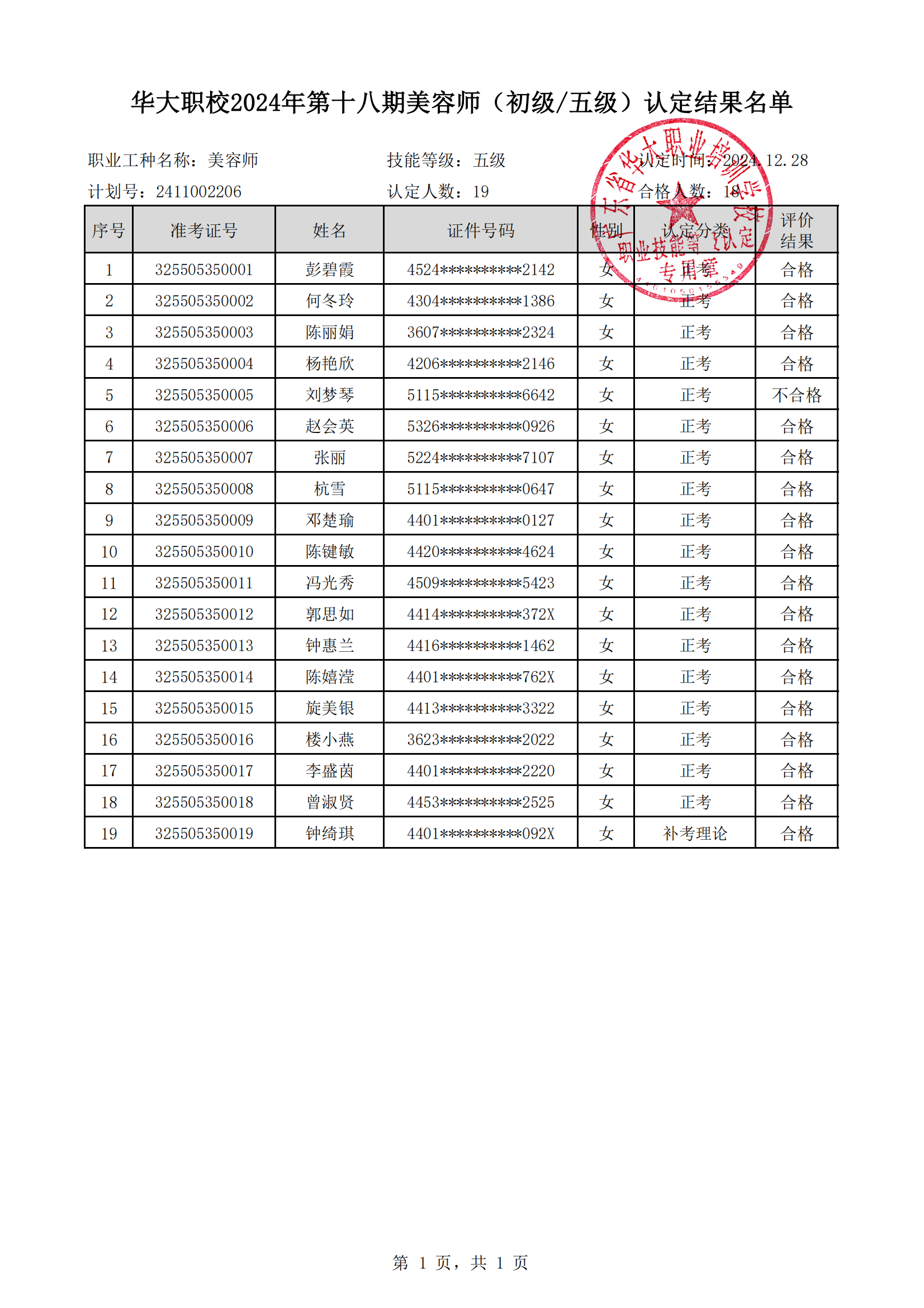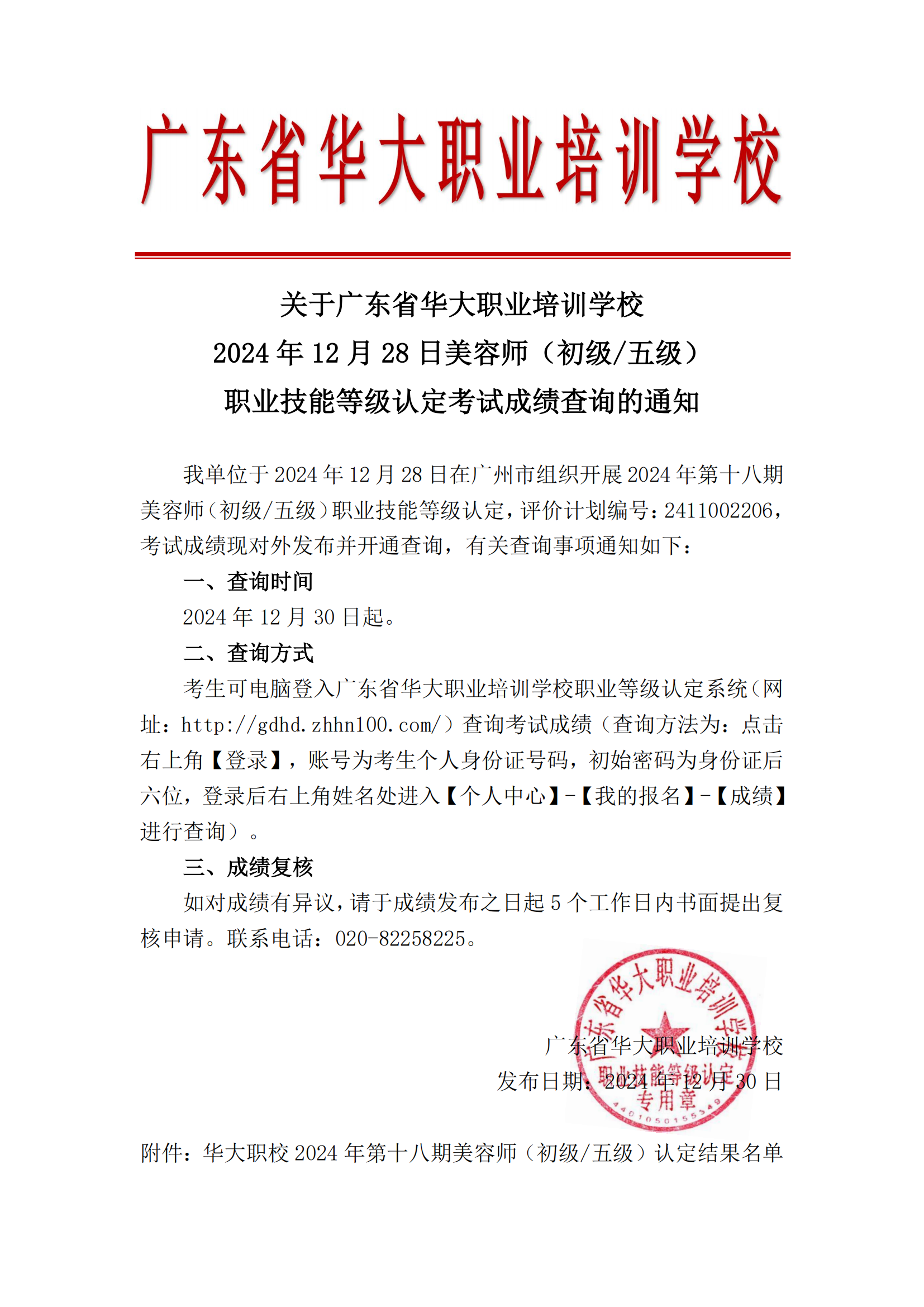 关于华大职校2024年第十八期美容师(初级/五级)等级认定考试成绩查询的通知(评价计划编号:2411002206)