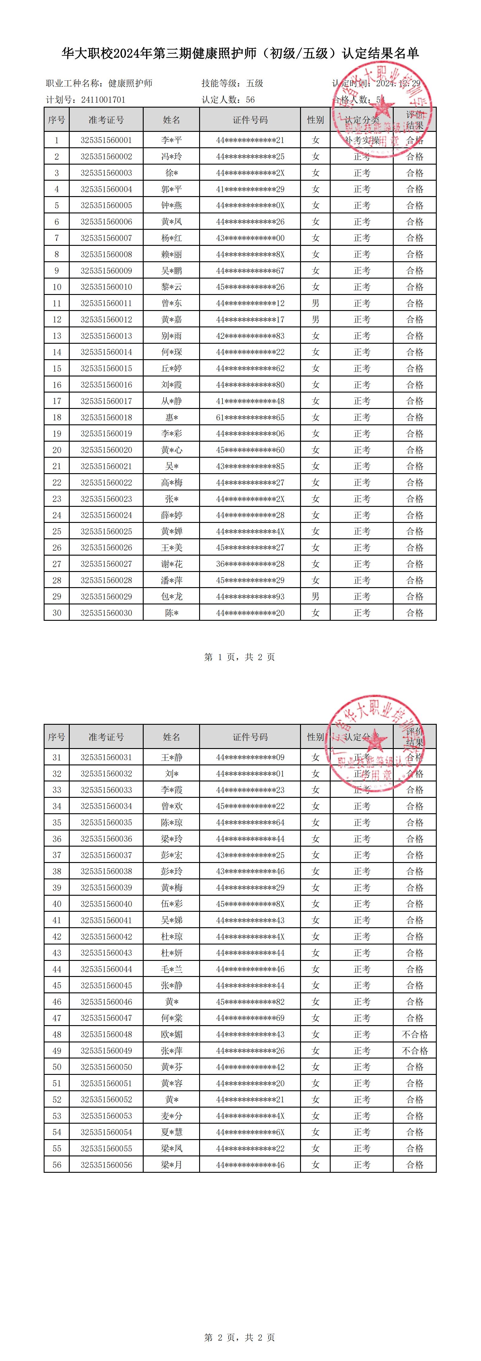 关于华大职校2024年第三期健康照护师(初级/五级)等级认定考试成绩查询的通知(评价计划编号:2411001701)