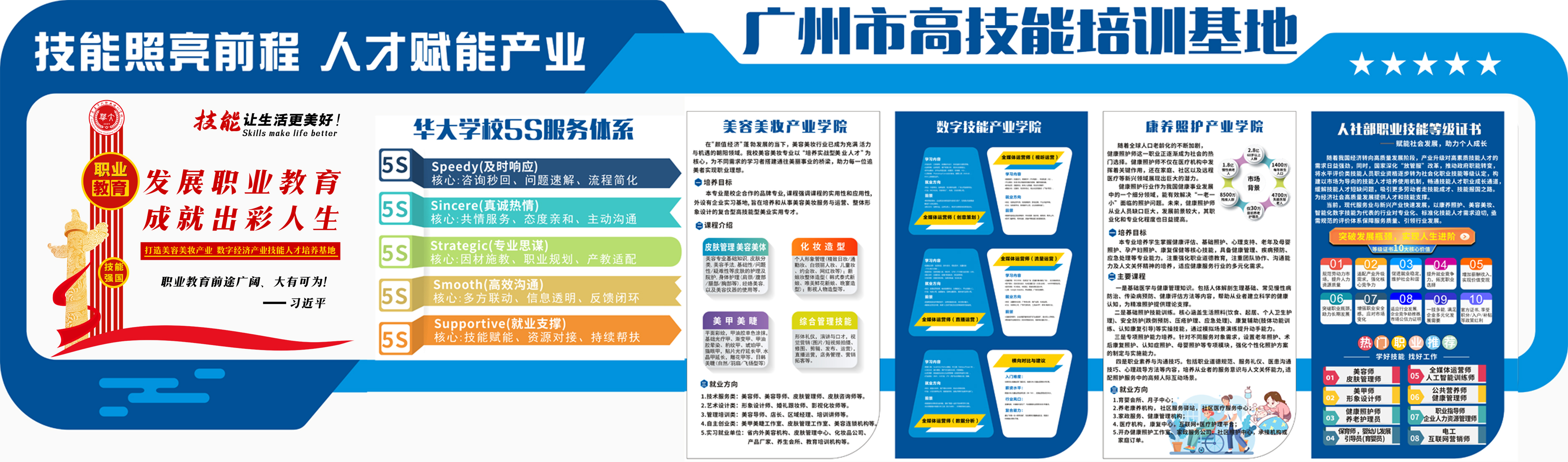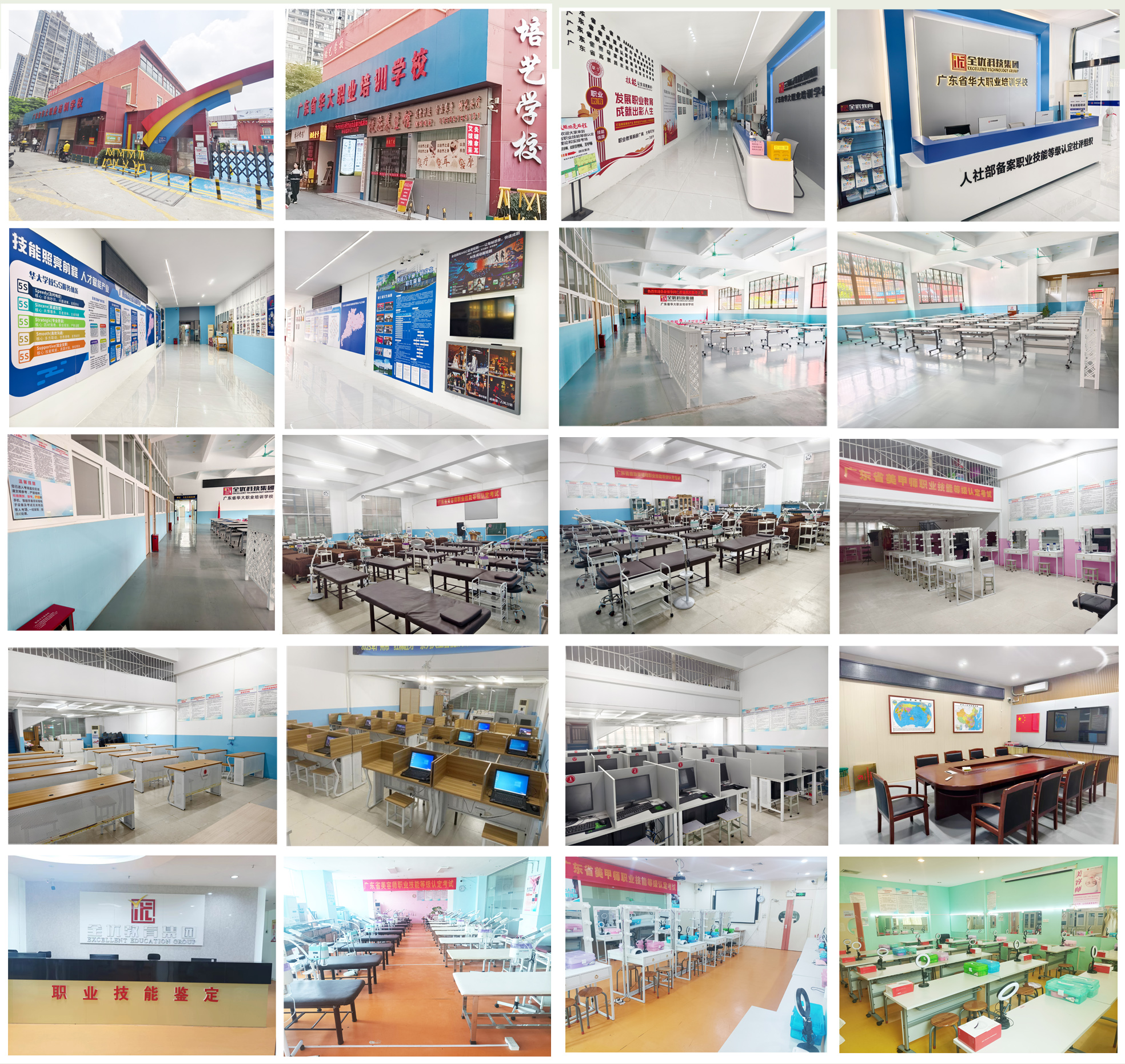 广东省华大职业培训学校始创于2009年,隶属全优教育科技集团有限公司,是经广东省人力资源和社会保障厅批准成立、广东省民政厅登记注册的一家专注职业技能培训、职业技能评价、专项职业能力培训、企业职工适岗培训、农业技术培训的综合型培训学校。目前,旗下10个教学中心,现有教学面积共计3600多平方米,30多个招生服务点,可开展包括美容师、皮肤管理师、形象设计师、健康管理师、公共营养师、保健调理师、互联网营销师、企业人力资源管理师、职业培训师、保育师、育婴员等职业技能工种的培训服务,年培训及服务量超过10000人。历经十几年的发展,集团公司拥有多家省级、市级、区级培训学校,分属教育部门和人社部门。其中,集团下属公司曾获得广州市人力资源和社会保障局审批成立国家职业技能鉴定所(广州市第一三二职业技能鉴定所),具有初级、中级、高级、技师、高级技师职业资格证考试鉴定资质,具有丰富的职业技能考试鉴定经验。