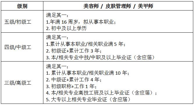 其中:美容师、美甲师要求16周岁以上,初中(含)以上学历,皮肤管理师要求高中/中专(含)以上学历。